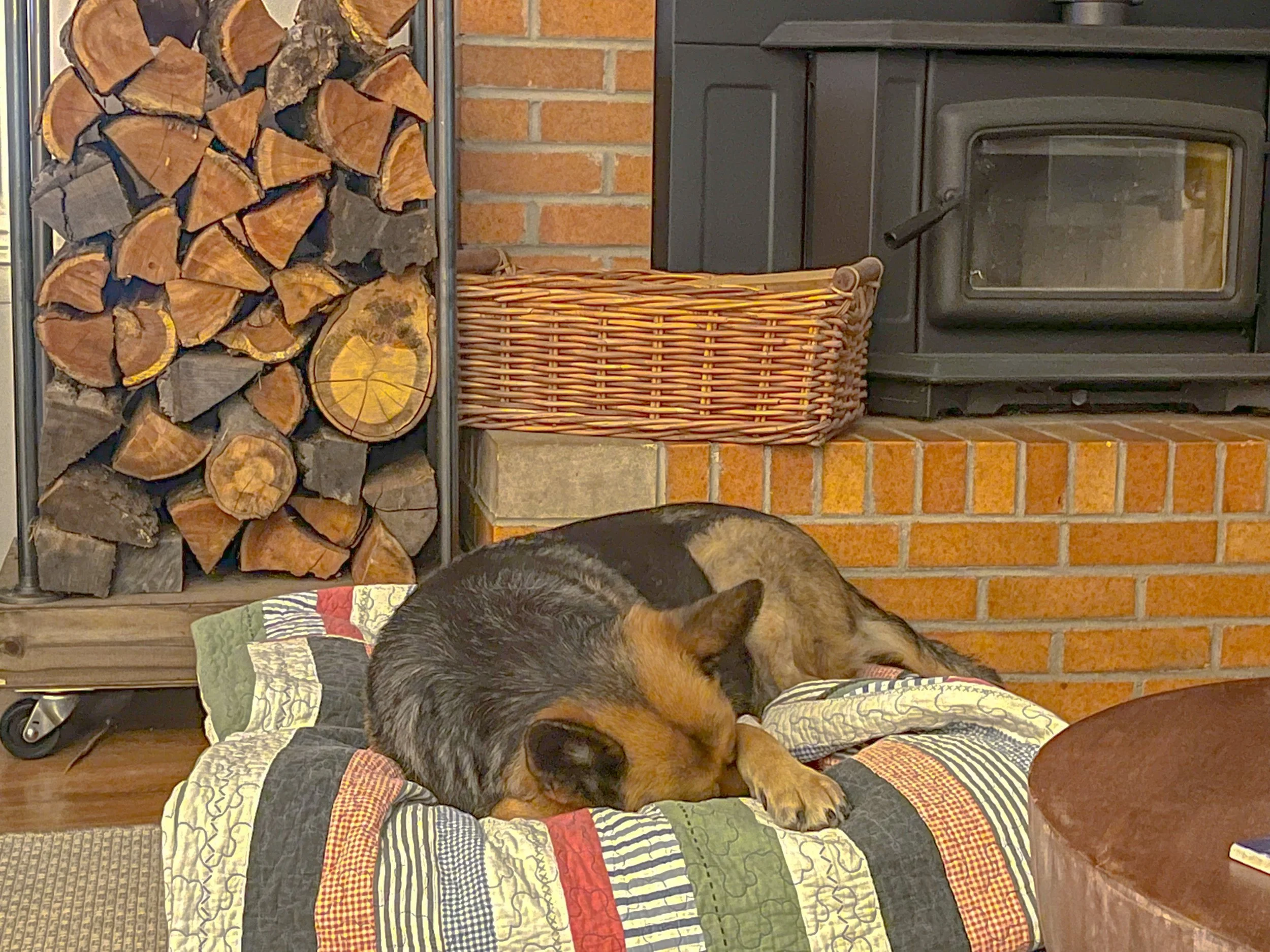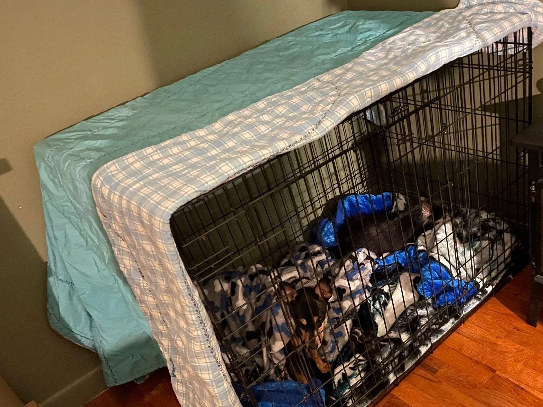 In a kennel at the foot of my bed: Sometimes a furry family member has trouble sleeping without their human so we have a large kennel set up in the corner of our bedroom that guests are welcome to use.